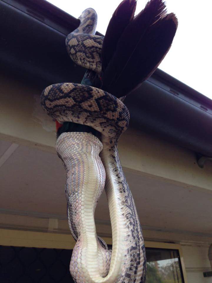 GRAPHIC CONTENT Looks like this currawong came off second best up against this snake. Neighbors watched an enormous snake as it moved on top of a garage roof until its owner returned home. He explained that while conducting an inspection at a family residence his colleague Dave found around 50 snake skins on the familys roof space.